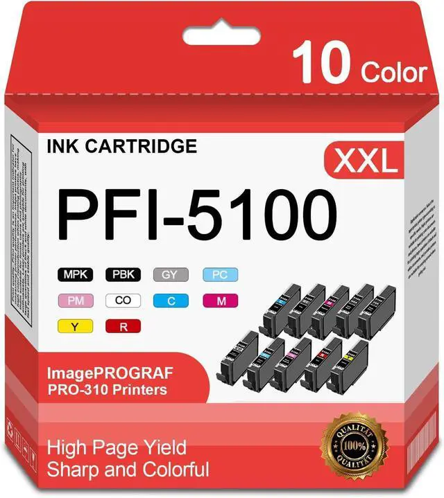 Pakage contents:10-Pack PFI-5100 Matte Black/Photo Black/Cyan/Magenta/Yellow/Red/Gray/Photo Cyan/ Photo Magenta/Chroma Optimizer Ink Cartridges