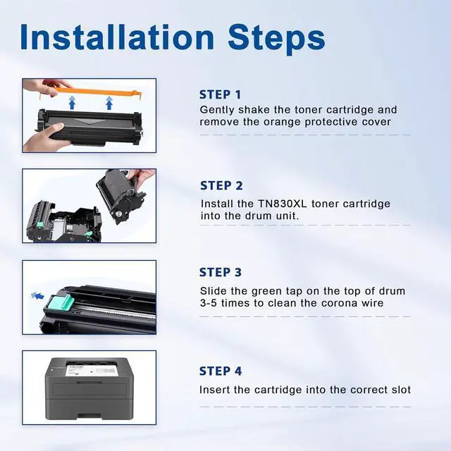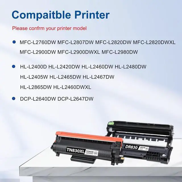 For Brother TN830XL Toner and DR830 Drum Compatible printers: HL-L2400D HL-L2405W HL-L2420DW HL-L2460DW HL-L2460DWXL HL-L2465DW HL-L2467DW HL-L2480DW HL-L2865DW DCP-L2640DW DCP-L2647DW MFC-L2760DW MFC-L2807DW MFC-L2820DW MFC-L2820DWXL MFC-L2900DW MFC-L2900DWXL MFC-L2980DW Printer