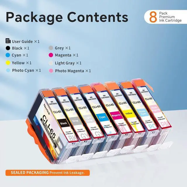 Package Contents: 8-Pack CLI-65 CLI-65BK CLI-65C CLI-65M CLI-65Y CLI-65PC CLI-65PM CLI-65GY CLI-65LGY Ink (1x CLI65 Black)(1x CLI65 Cyan)(1x CLI65 Magenta)(1x CLI65 Yellow)(1x CLI65 Photo cyan)(1x CLI65 Photo magenta)(1x CLI65 Grey)(1x CLI65 Light grey)