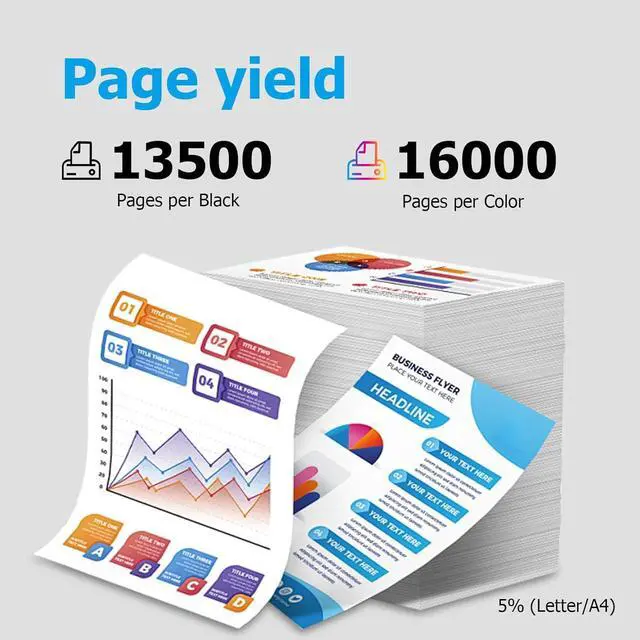 Page Yield: Approximately 13,500 pages per black toner cartridge, 16,000 pages per color toner cartridge at 5% coverage of A4/letter.