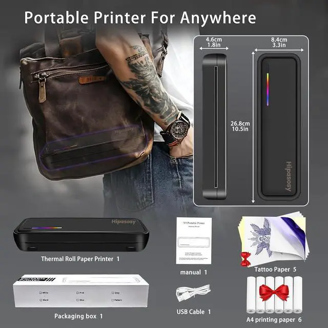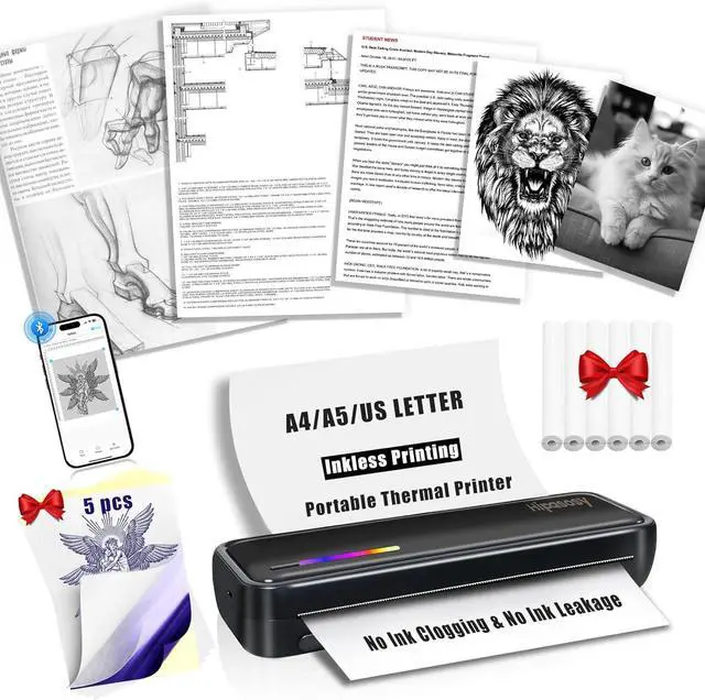 Anywhere PrintingThis portable Bluetooth thermal printer features a 2600mAh battery for 12 hours of continuous mobile use. Ideal for on-the-go printing (travel, office, home, car, outdoors), it handles office documents, contracts, invoices, receipts, delivery notes, boarding passes, engineering drawings, etc. Includes tattoo stencil printing capability with 5 sheets of specialty paper.