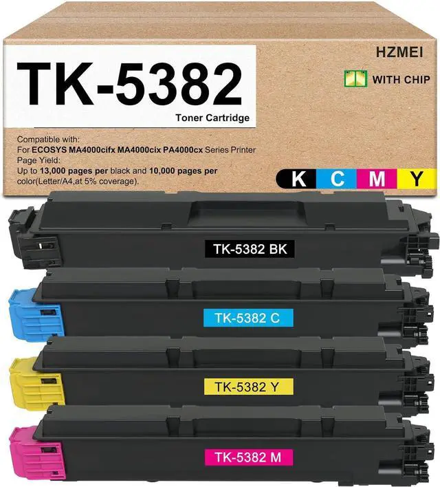 Package Contents:TK-5382 Toner Cartridge High Capacity Toner Cartridge;TK-5382 Black Toner Cartridge,TK-5382 Cyan Toner Cartridge,TK-5382 Magenta Toner Cartridge,TK-5382 Yellow Toner Cartridge - Total 4 Pack