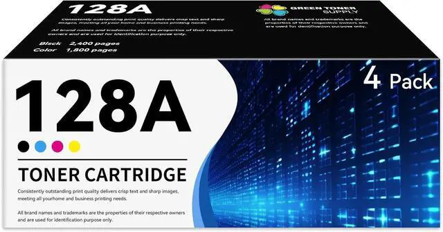 Whats in the box: 4 Pack Replacement for HP 128A CE320A CE321A CE322A CE323A Toner Cartridges (1xBlack + 1xCyan + 1xYellow + 1xMagenta)