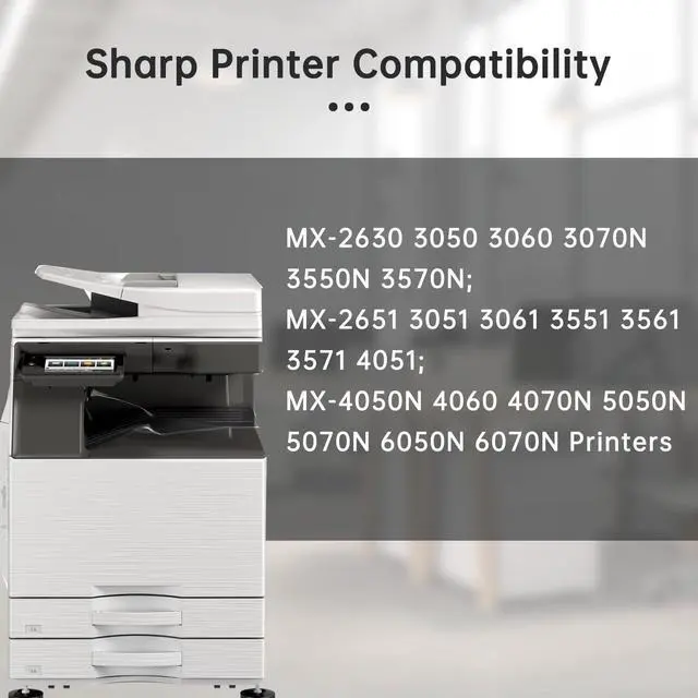 Compatible List: Compatible for Sharp MX-61NT toner cartridge replacement for Sharp MX-2651 MX-3051 MX-3061 MX-3071 MX-3551 MX-3561 MX-3571 MX-4051 MX-4061 MX-2630N, MX-2651, MX-3050N, MX-3050V, MX-3070N, MX-3070V, MX-3071, MX-3550N, MX-3550V, MX-3551, MX-3570N, MX-3570V, MX-357, MX-4050N, MX-4050V, MX-4051, MX-4070N, MX-4071, MX-5050N, MX-5070N, MX-5070V, MX-6050N, MX-6050V, MX-6070N, MX-6070V, MX-3560V, MX-3060V Printers