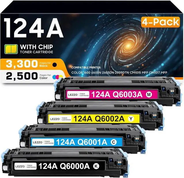 Products in the package: 124A Toner Cartridge 4 Pack, 1x Q6000A Black Toner Cartridge,1x Q6001A Cyan Toner Cartridge,1x Q6002A Yellow Toner Cartridge,1x Q6003A Magenta Toner Cartridge