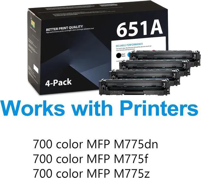 What's in the box: 1x Black (CE340A), 1x Cyan (CE341A), 1 x Magenta (CE343A), 1 x Yellow (CE342A) 4-Packs of standard yield 651A toner cartridges with chips