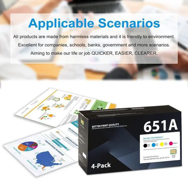 High Page Yield (approx): Up to 14,000 pages for 651A black toner cartridge and 16,500 pages for 651A color toner cartridge (Letter/A4, at 5% Coverage)