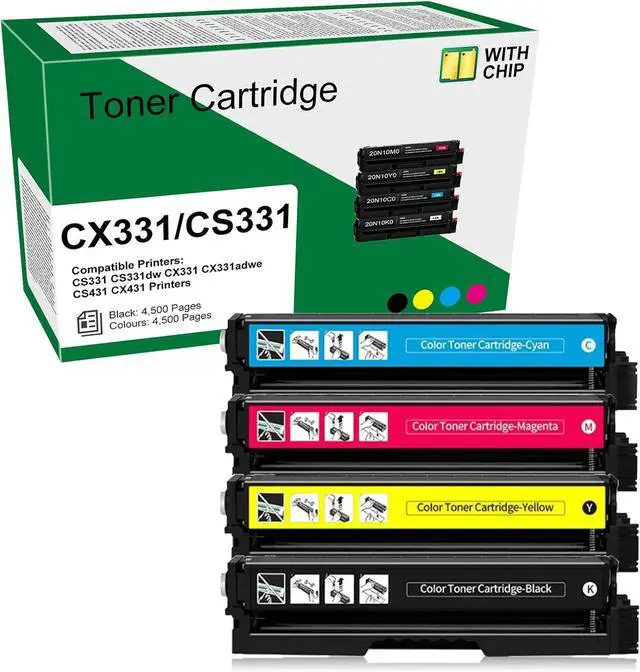 Package List: 4 Pack CX331 CS331 Toner Cartridge Set (1x Black 20N10K0 Toner Cartridge, 1x Cyan 20N10C0 Toner Cartridge, 1x Magenta 20N10M0 Toner Cartridge, 1x Yellow 20N10Y0 Toner Cartridge)