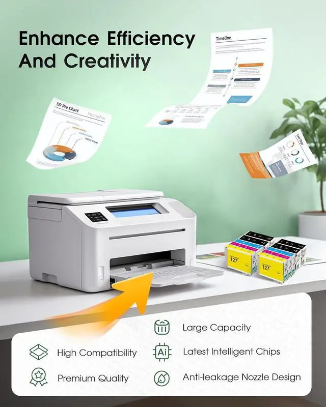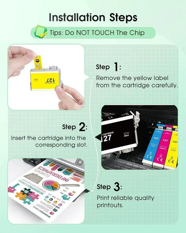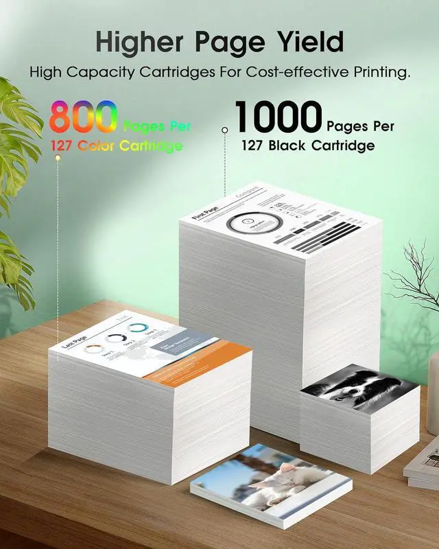 3.High Page Yiled: Up to 1000 pages per for epson 127 black ink cartridges ,800 pages per for epson ink 127 color ink cartridges (Letter, at 5% coverage).
