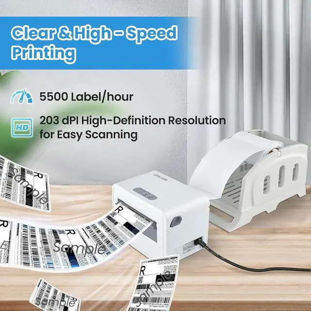 - : Equipped with a high-tech thermal print head, this 4x6 thermal label printer delivers up to 203 DPI high-density resolution, ensuring crisp, clear prints. It supports a wide range of label widths and a printing speed of 150mm/sec, this printer supports advanced thermal printing technology. No ink or toner is required, ensuring a mess-free, clean operation. Works with both fold labels and roll labels. This printer provides efficient and reliable performance.