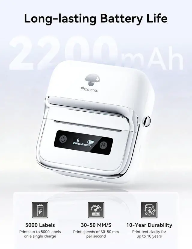 Extended Battery & High-Speed Performance: Equipped with a 2200mAh rechargeable battery, the M250 Bluetooth thermal label printer prints up to 5000 labels per charge. It delivers crisp labels at 3050mm per second and includes an energy-saving auto sleep mode, shutting down after 5 minutes of inactivity to preserve power.