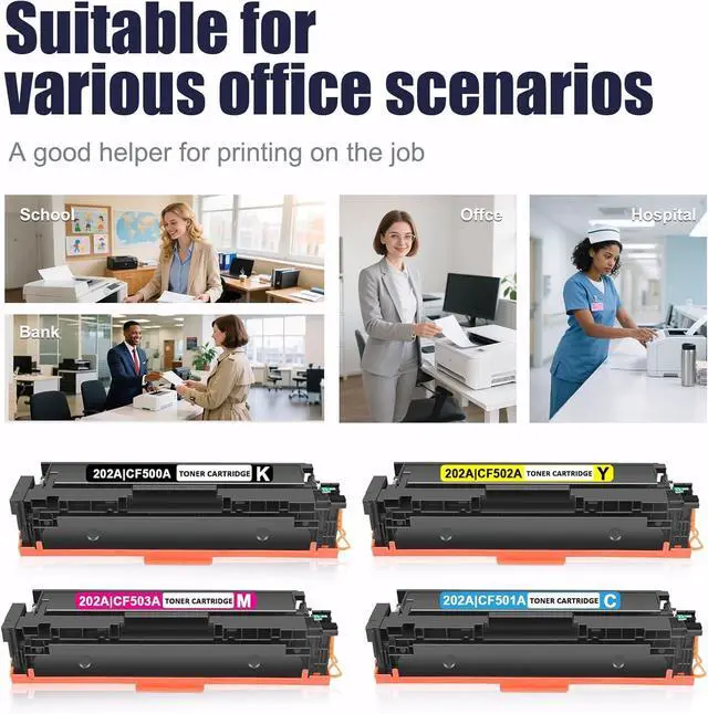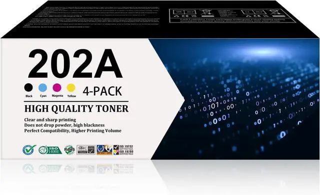 Package Contents: 4 Pack 202A Toner Cartridge (1Black/ 1Cyan/ 1Magenta/ 1Yellow)