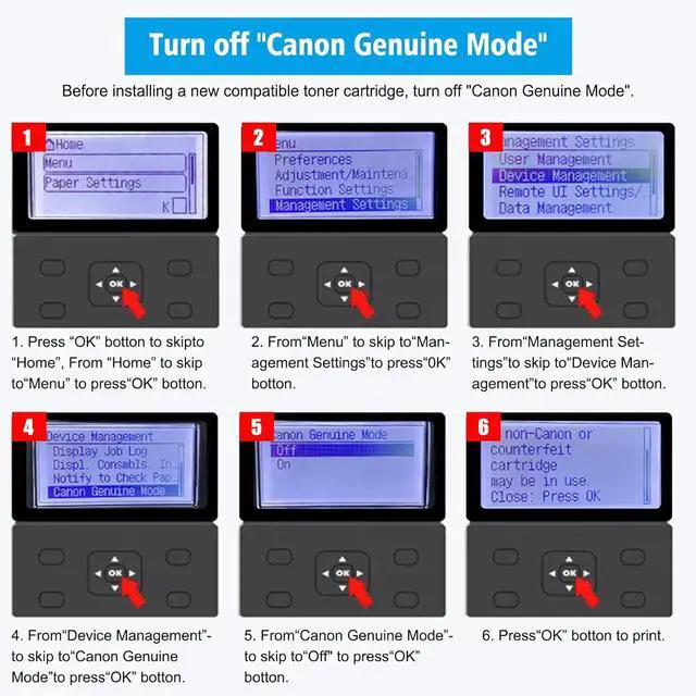 4. Attention: If there is Canon Genuine Mode in your printer, please must close this mode, Close Canon Genuine Mode as follow step: Menue > Management Settings > Device Management > Canon Genuine Mode > Off, After you close Canon Genuine mode, you install the compatible toner, there is prompt non Canon Cartridge is possibly inserted on printer, just press OK key for single function printer, or click "Close" on screen for multi function printer, the toner should work.