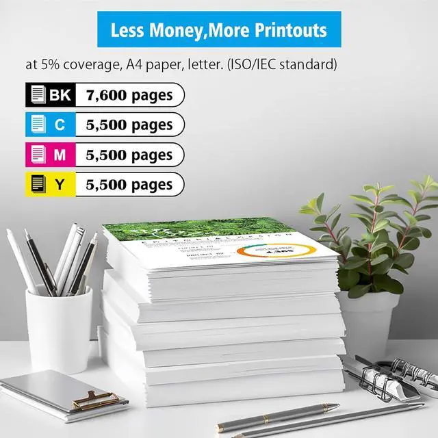 2. Page Yield: High Capacity, Black 7600 Pages, Cyan Magenta Yellow 5500 Pages at 5% coverage, A4 paper, letter. (ISO/IEC standard). Counter chip advantage: To ensure optimal performance and true color reproduction, our toner cartridges are equipped with counter chips. Other cartridges with decorative chips may result in suboptimal print quality and color inaccuracies.