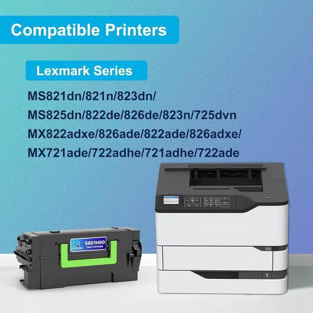 Wide Compatibility Lexmark mx722 Toner: This black toner cartridge (OEM code: 58D1H00) replaces Lexmark 58D1H00, 58D1H0E, 58D0HA0, 58D0H0G toner cartridge