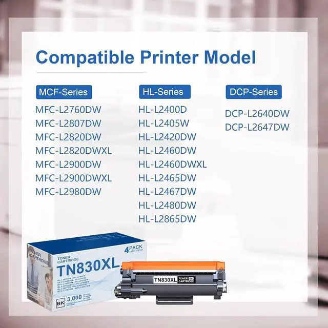 Package Contents: 4-Pack Compatible High Yield Toner Cartridge For TN830XL TN830 XL 830XL Toner Cartridge
