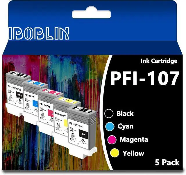 Package Contains: 5 Pack, 1 Matte Black ( PFI-107mbk ), 1 Black ( PFI 107bk ), 1 Cyan (PFI-107 cyan), 1 Magenta ( PFI-107m ), 1 Yellow ( PFI107y )