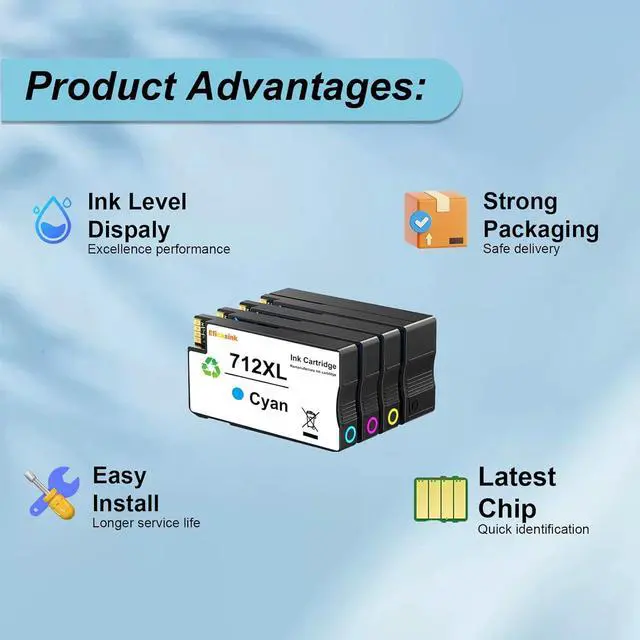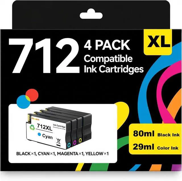 Package contents: 4 Packs of 712XL Ink Cartridge (1 Black 1 Cyan 1 Magenta 1 Yellow)