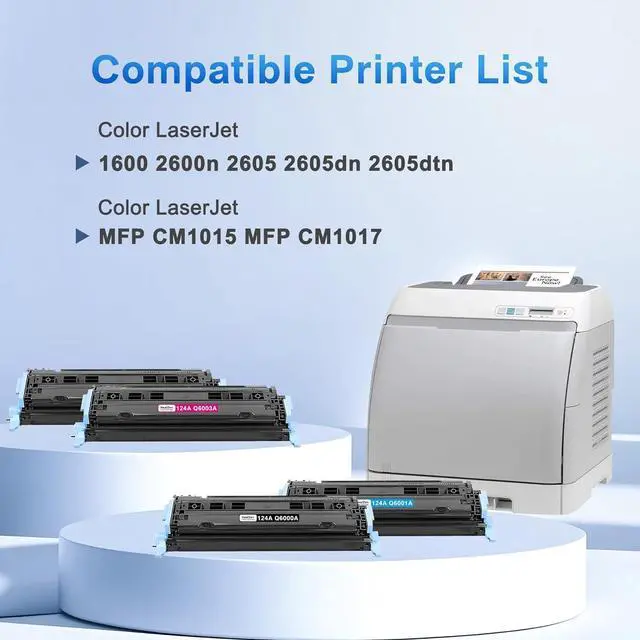 Compatible Printer List: Our 124a toner cartridge designed replacement for HP Color LaserJet 1600 2600 2600n 2605 2605dn 2605dtn, Color LaserJet MFP CM1015 MFP CM1017 printer, ensuring perfect alignment and functionality to keep office printers running smoothly, please confirm your printer model before placing the order.