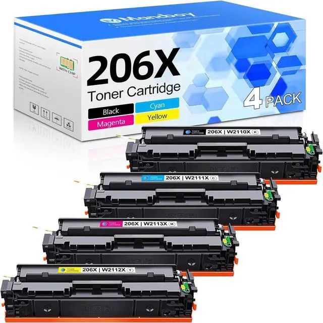 What's in the box: 1 x 206X black toner (W2110X) ,1 x 206X cyan toner (W2111X) ,1 x 206X magenta toner (W2113X) ,1 x 206X yellow toner (W2112X) 4-Packs of 206X toner cartridges with chips