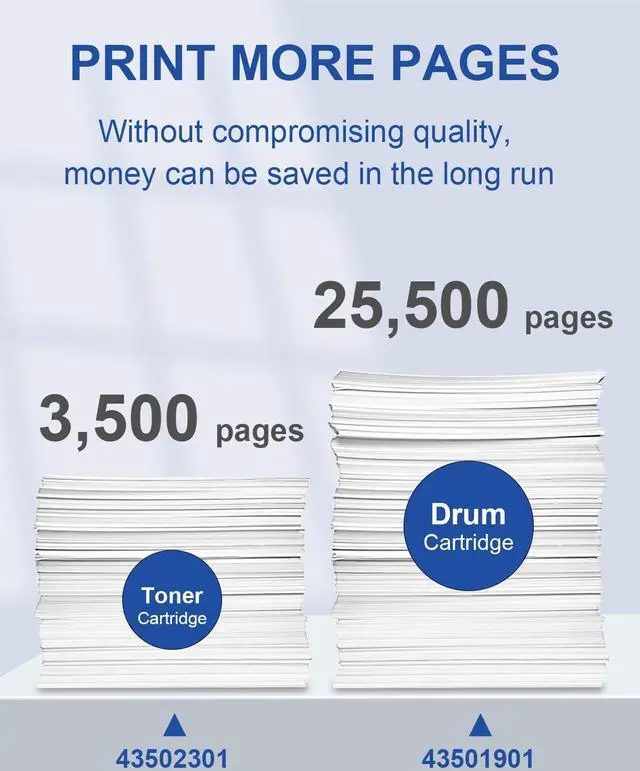 High Page Yield: up to 25500 pages per 43501901 black drum cartridge,up to 3500 pages per 43502301 black toner cartridge