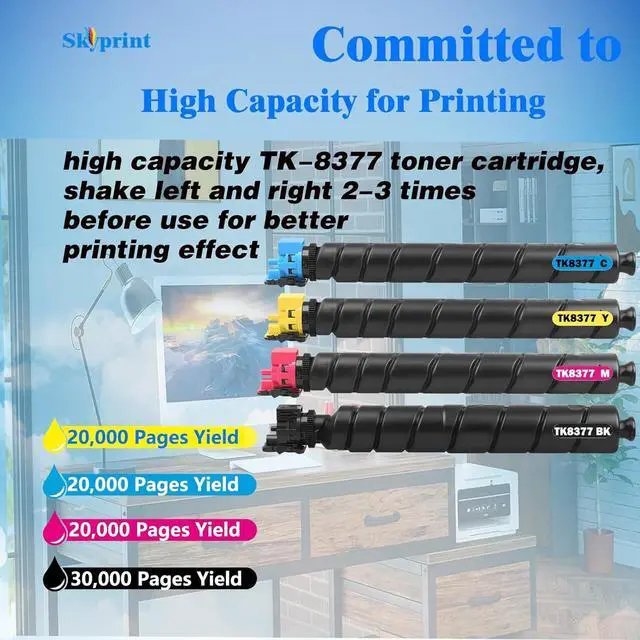 SkyPrint TK8377 toner cartridges come with intelligent chips that automatically recognize and provide printing, Not damaging the machine,Shake the toner cartridge horizontally 2-3 times before use to evenly distribute the toner,providing you with better clear and natural printing effects