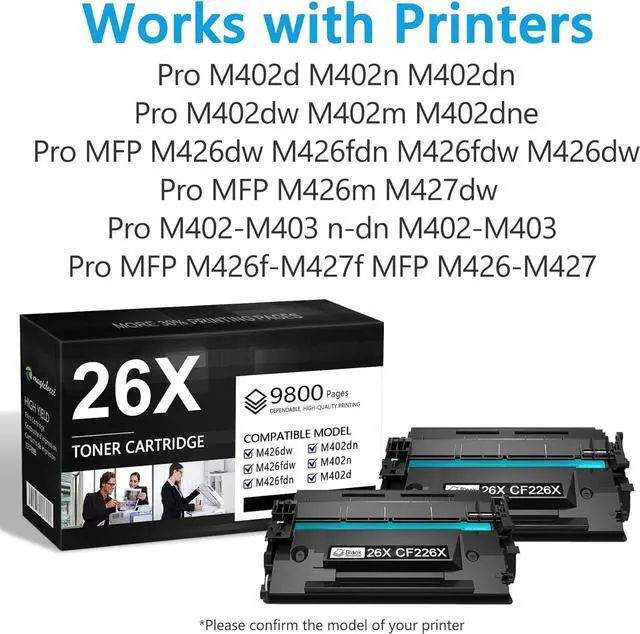 Printer Compatibility: 26X toner cartridges Compatible with Pro M402dn M402d M402n M402dw; Pro MFP M426dw M426fdn M426fdw Printers
