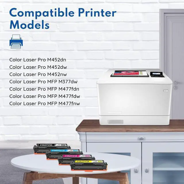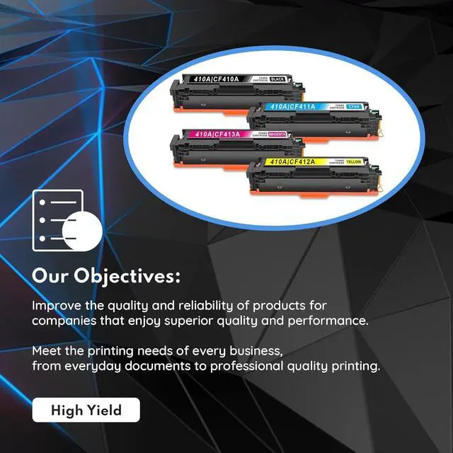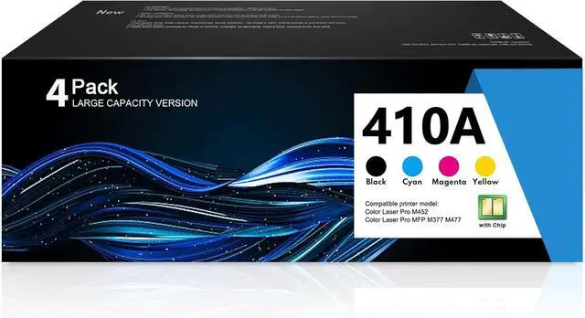What's in the box: new 410A Toner Cartridges 4-Pack (1 Black, 1 Cyan, 1 Magenta, 1 Yellow) (with Chip)