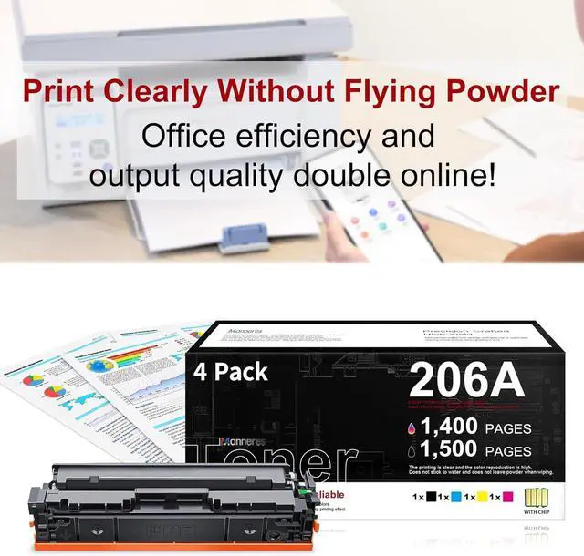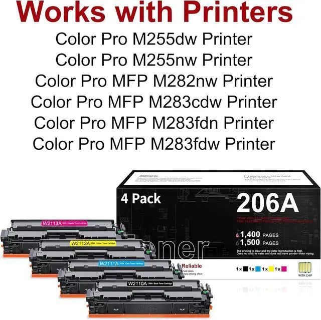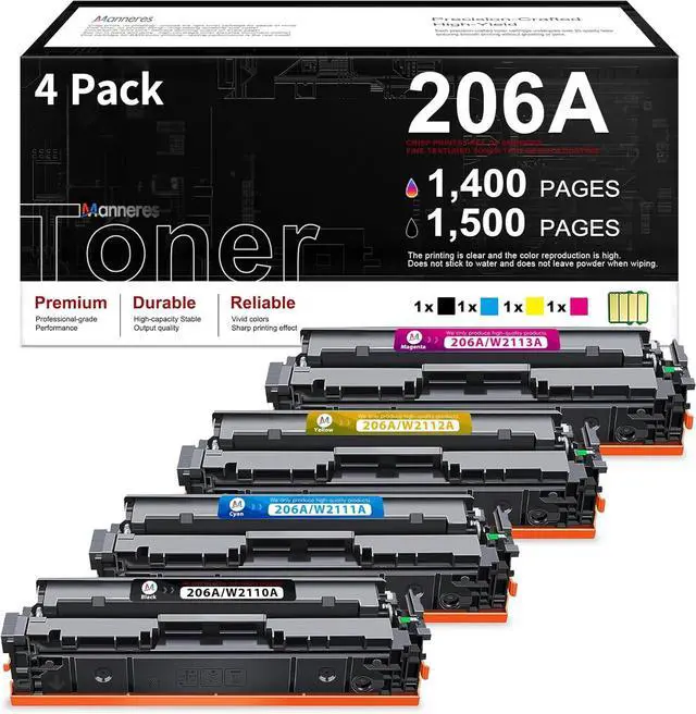 Package contents: 1x 206A W2110A black toner, 1x 206A W2111A cyan toner, 1x 206A W2112A yellow toner, 1x 206A W2113A magenta toner (Each toner cartridge is pre-installed with an advanced chip and comes with a detailed installation guide)