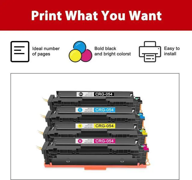 • Include: 4 Pack 054 Toner replacement for Canon 054 toner cartridge set (1 X 054 Black Toner Cartridge, 1 X 054 Cyan Toner Cartridge, 1 X 054 Magenta Toner Cartridge, 1 X 054 Yellow )