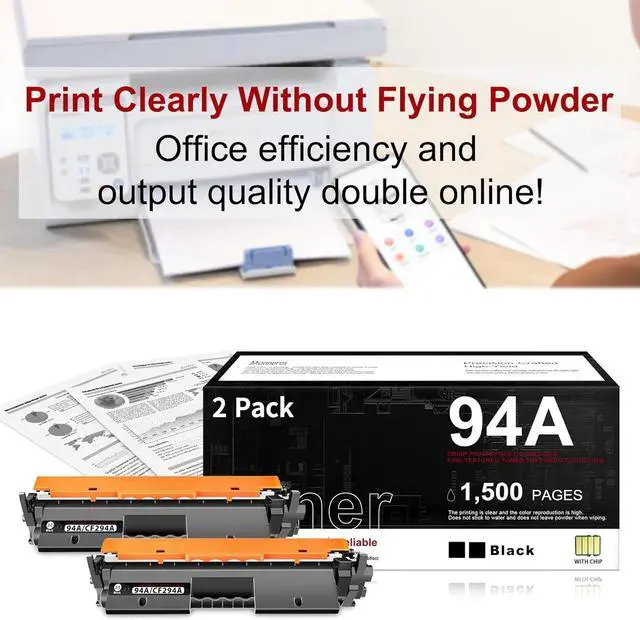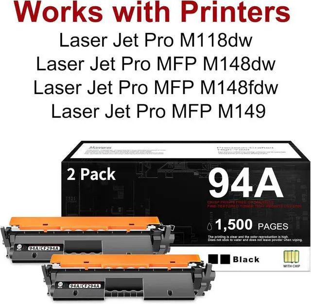 Package contents: 2 Pack Black 94A CF294A Toner Cartridges (Each toner cartridge is pre-installed with an advanced chip and comes with a detailed installation guide)