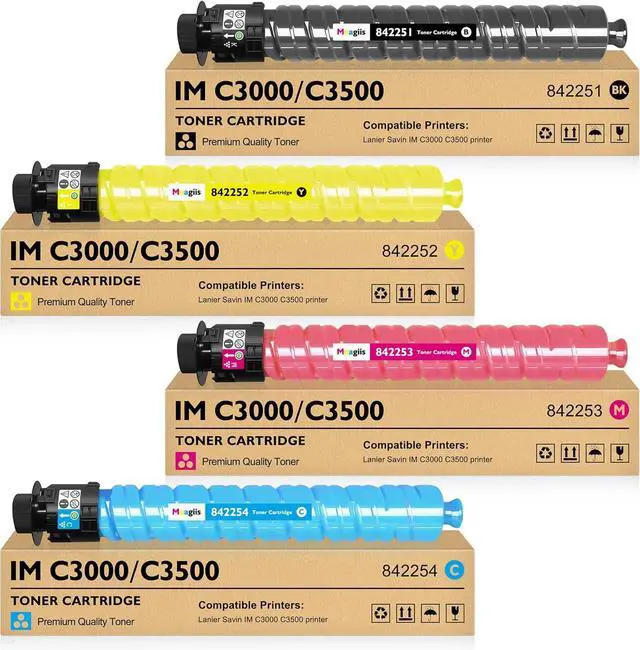 Package Contents: 4-Pack IM C3000 IM C3500 Toner Cartridge replacement for Ricoh IMC3000 IMC3500 Toner Cartridges (1 x 842251 Black, 1 x 842254 Cyan, 1 x 842253 Magenta, 1 x 842252 Yellow)