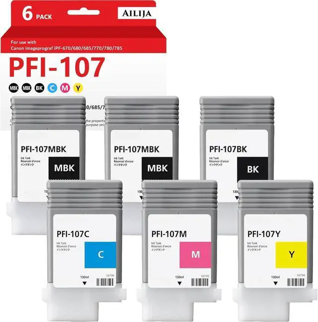 Package Contents: 6 Pack Compatible Canon PFI-107 Ink Cartridge (2*PFI-107MBK, PFI-107BK, PFI-107C, PFI-107M, PFI-107Y)