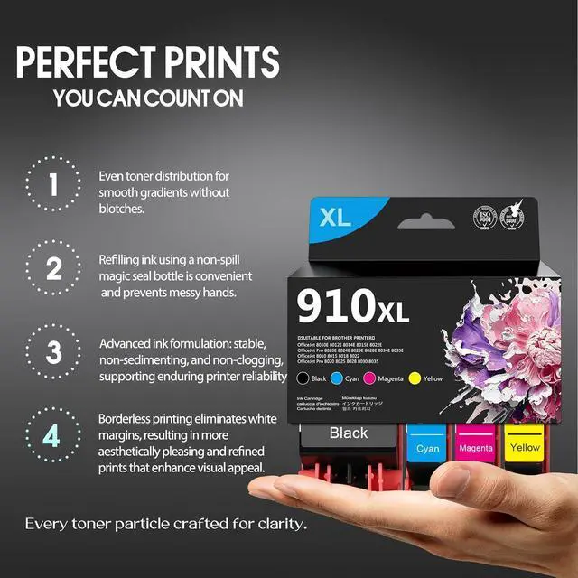 High print quality: 910XL ink delivers crisp, sharp text printing with clean edges, rich black density and excellent legibility