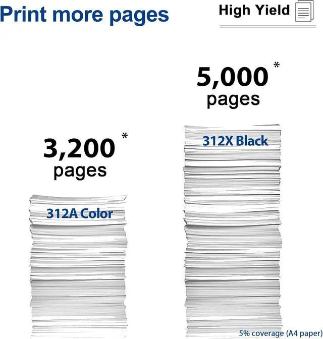 High Page Yield: Enjoy impressive page yields with the black 312X | CF380X toner providing up to 5,000 pages and each color toner cartridge (CF381A, CF382A CF383A) offering up to 3,200 pages at 5% page coverage. Ideal for high-volume printing needs