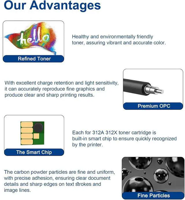 Sustainable & Responsible Printing: Our 312A/312X toner cartridges are manufactured using eco-conscious materials and processes, helping to reduce environmental impact. All components are RoHS-compliant and recyclable, supporting a greener printing solution for businesses and individuals who value sustainability