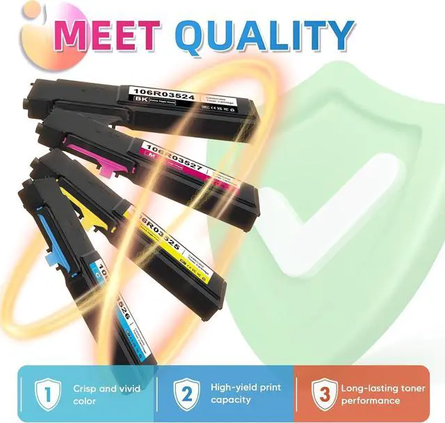 Package Contents: 106R03524 Black Toner Cartridge x1, 106R03525 yellow Toner Cartridge x1, 106R03526 cyan Toner Cartridge x1, 106R03527 magenta Toner Cartridge x1