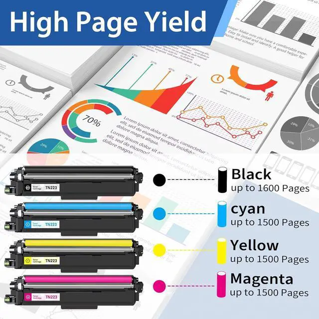 High Capacity: 1,600 pages for each TN223 Black Toner Cartridge, 1,500 pages for each TN223 Color Toner Cartridge (5 percent coverage of letter A4)