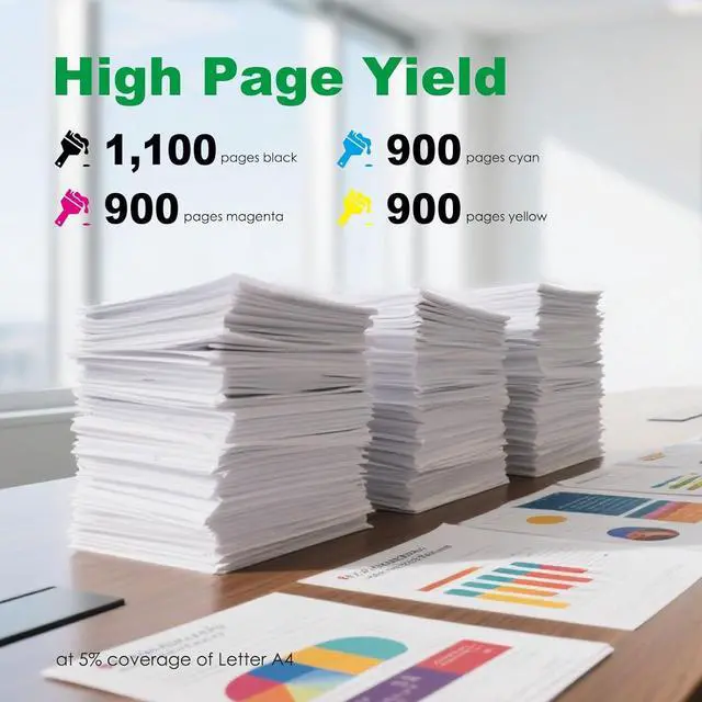 Page Yield: Up to 1,100 pages per Black Toner Cartridge and 900 pages per color toner cartridge at 5% coverage (A4/Letter)