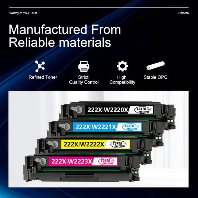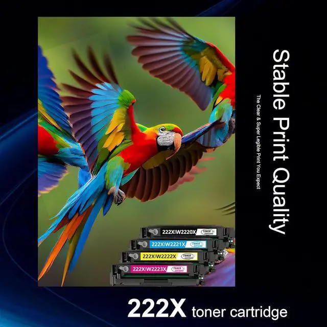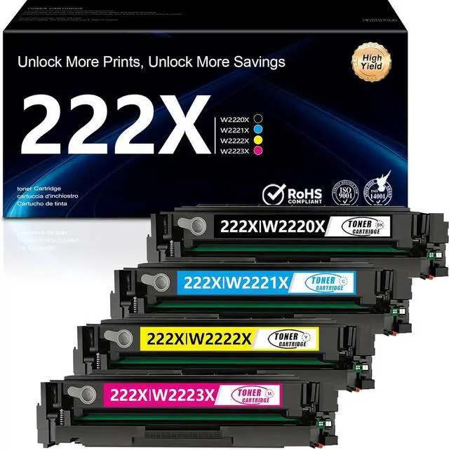 Package Includes: 222X Toner Cartridge 4 Pack (1 × 222X | W2220X Black, 1 × 222X | W2221X Cyan, 1 × 222X | W2222X Yellow, 1 × 222X | W2223X Magenta)