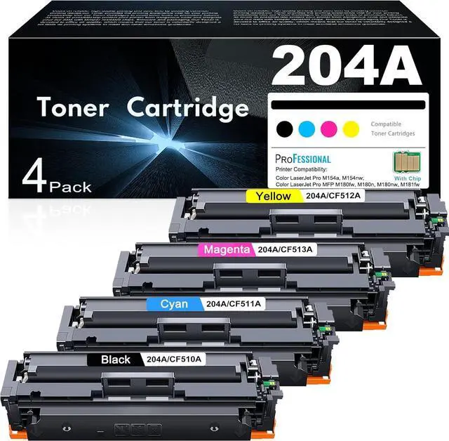 Products contain4-Pack of replacement for HP 204A CF510A with chip toner cartridges (1*CF510A Black toner,1*CF511A Cyan toner,1*CF512A Yellow toner,1*CF513A Magenta toner)