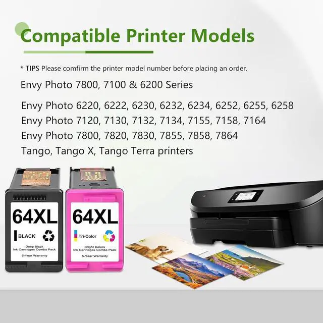 Ink 64XL Compatible Printers: Envy Photo 6220, 6222, 6230, 6232, 6234, 6252, 6255, 6258; Envy Photo 7120, 7130, 7132, 7134, 7155, 7158, 7164; Envy Photo 7800, 7820, 7830, 7855, 7858, 7864; Tango, Tango X, Tango Terra printers