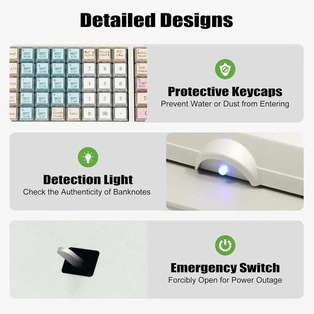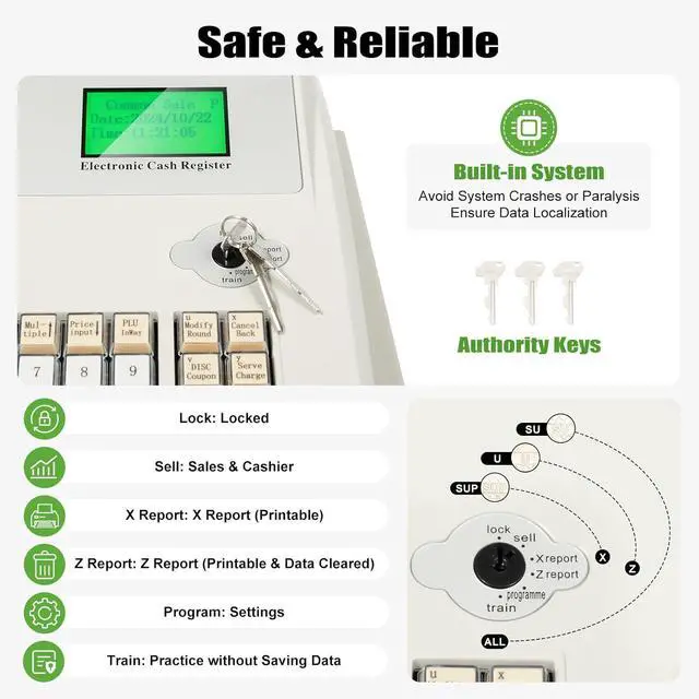 Offline Reliability & Data Safety:Cash register no network needed avoids crashes/hacking risks. 6 permission levels via gear keys.Emergency switch manually opens cash drawer during power outages.