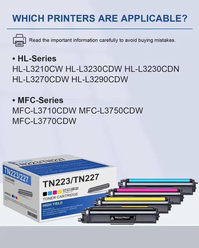 Quantity: TN-227 Toner Cartridges 4 Pack, TN227BK TN227C TN227M TN227Y Toner Cartridges(1BK/1C/1M/1Y)