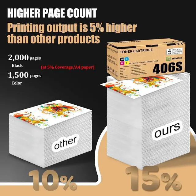 Estimated Page Yield: 2,000 pages high resolution print per CLT-K406S BK Toner Cartridge at 5% coverage; 1,500 pages high resolution print per CLT-C406S M406S Y406S C/M/Y Toner Cartridge at 5% coverage.