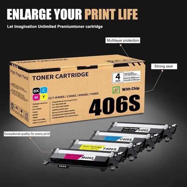 Package Contents: 1 Pack CLT-K406S Black Toner Cartridge; 1 Pack CLT-C406S Cyan Toner Cartridge; 1 Pack CLT-M406S Magenta Toner Cartridge; 1 Pack CLT-Y406S Yellow Toner Cartridge.