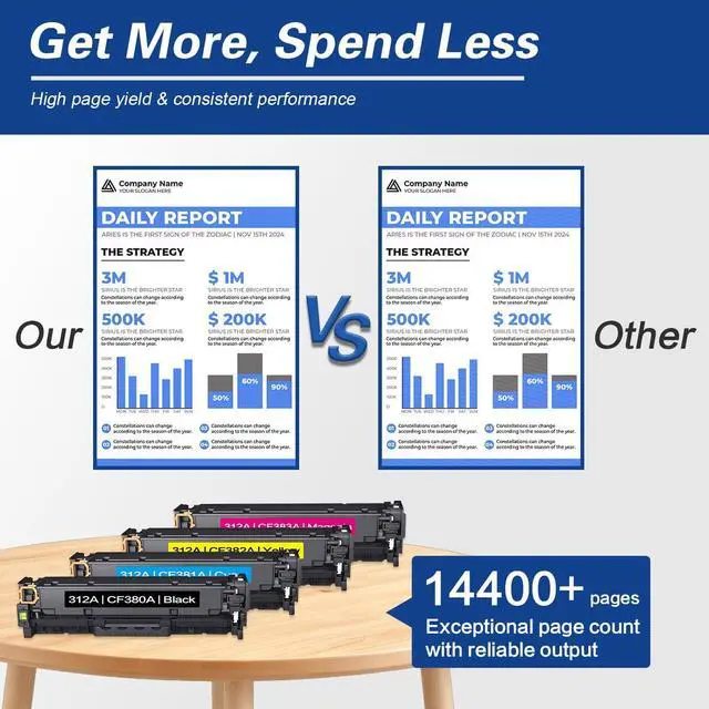 High Page Yield: 4800 Pages for each 312A Black toner, Up to 3,200 Pages for each 312A Color toner (based on 5% Coverage per A4 paper)