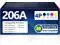 The product packaging includes: 1 x 206A W2110A Black Toner, 1 x 206A W2111A Cyan Toner, 1 x 206A W2112A Yellow Toner, 1 x 206A W2113A Magenta Toner