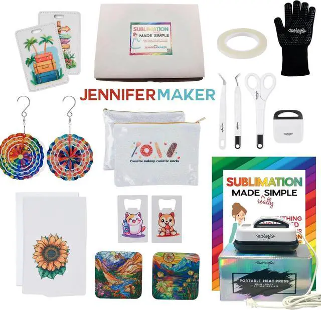 Complete Sublimation Starter Kit: Jump into sublimation crafting without needing a printer! This limited edition MakerFlo x JenniferMaker kit includes colorful pre-printed sublimation designs, a full tool kit, and step-by-step instructionsperfect for beginners and experienced crafters looking to explore sublimation projects with ease.