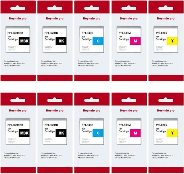 Package Contents: PFI-030MBK PFI-030BK PFI-030C PFI-030M PFI-030Y Ink Cartridge (2 Matte black , 2 Black, 2 Cyan, 2 Magenta, 2 Yellow)